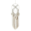 Add a special soft bohemian touch to your room with this natural macrame wall hanging dream catcher. Cross weaving in a circle + feather shaped hanging fringe.